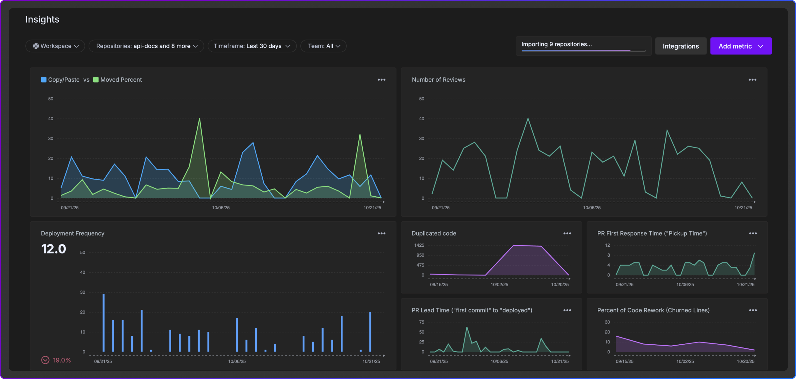 GitKraken Insights is a software engineering intelligence platform that provides full SDLC visibility into code velocity, quality, and AI impact. It speeds up time to insight by combining GitKraken’s native dev-workflow data with analytics from GitClear. This partnership delivers DORA metrics, defect and rework analysis, technical debt tracking, AI impact measurement, and developer satisfaction indicators at a fraction of the cost of legacy engineering intelligence tools.