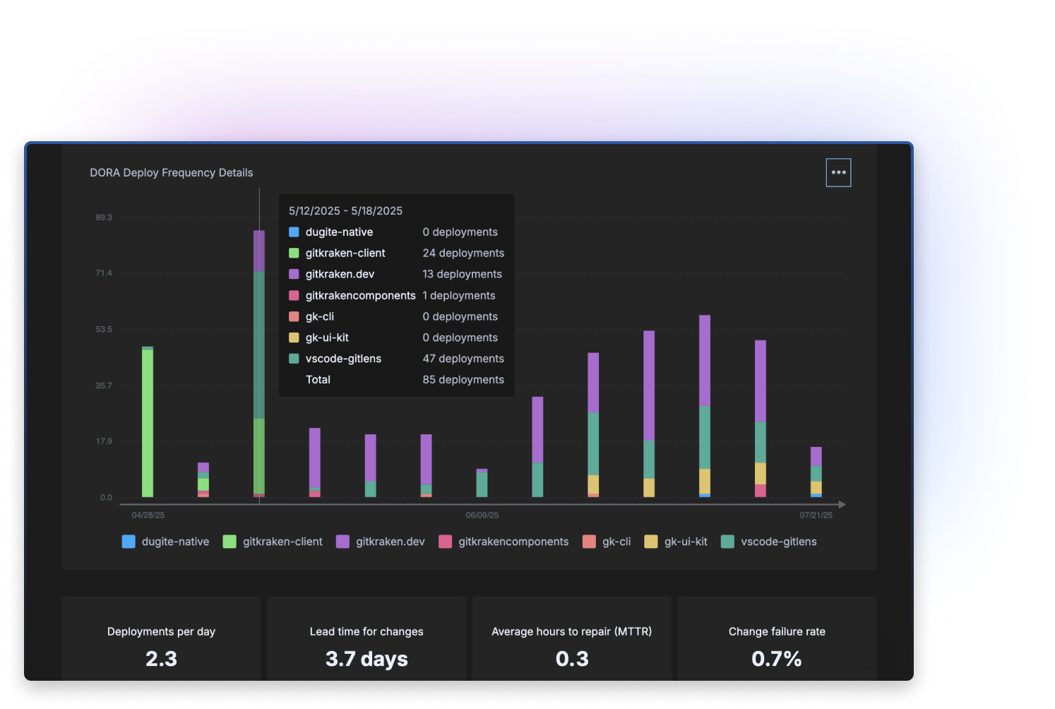 Understand deployment distribution across your codebase to reveal which repositories are deployment bottlenecks and identify teams that might need support. See velocity patterns that indicate technical debt or process issues, so when one repo shows 47 deployments while another shows zero, you immediately know where to focus optimization efforts.