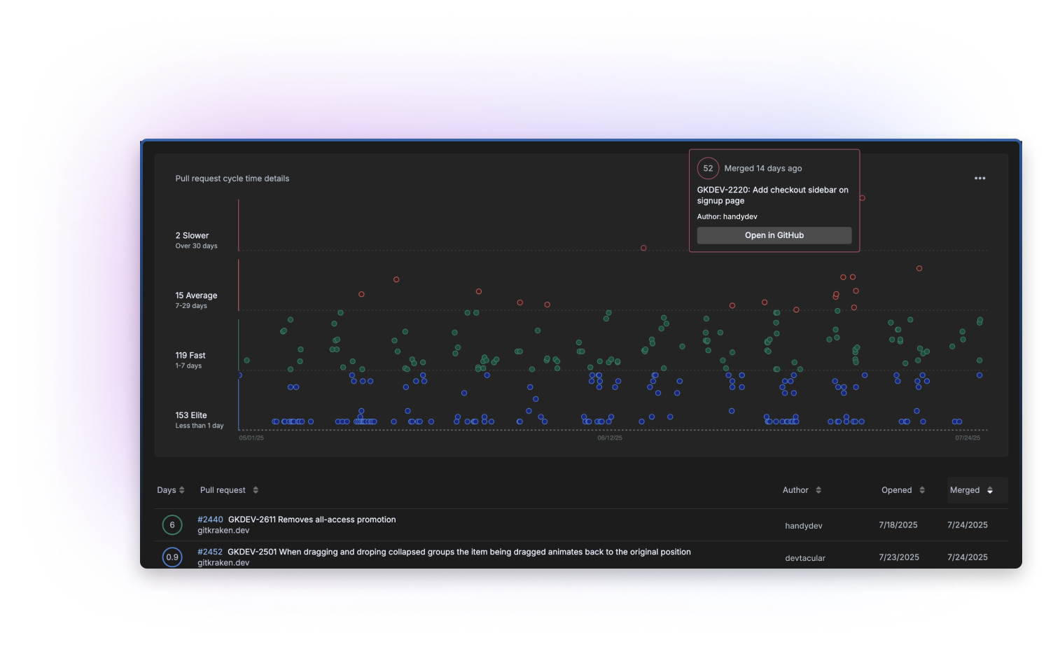 Transform PR cycle time from a single number into actionable intelligence. See which pull requests are outliers, identify patterns in fast vs. slow reviews, and spot bottlenecks before they impact delivery. Scatter plot analysis reveals whether slow PRs are one-offs or systematic issues that need process optimization.