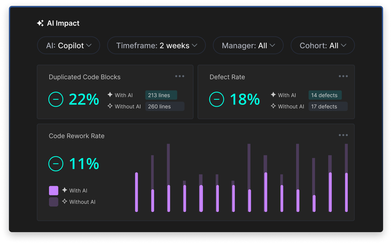 Measure the productivity impact of Copilot, Cursor, and other AI tools with code quality, review time, and satisfaction metrics