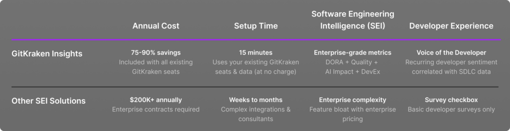 Insights helps engineering leaders make data-driven decisions by connecting developer satisfaction with delivery performance through GitKraken.dev. Leaders can identify velocity blockers before they impact sprints, prove AI tool ROI to executives, and get industry benchmarking that translates engineering performance into business language. The platform provides executive-ready reporting with 75-90% cost savings compared to legacy tools.