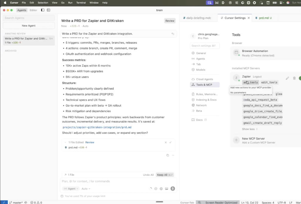 The result? When Geoghegan typed a single sentence into Cursor—”Write a PRD for the Zapier and GitKraken integration”—the AI didn’t need hand-holding. It searched company strategy documents, existing PRD templates, his current priorities, even his GitKon presentation notes.