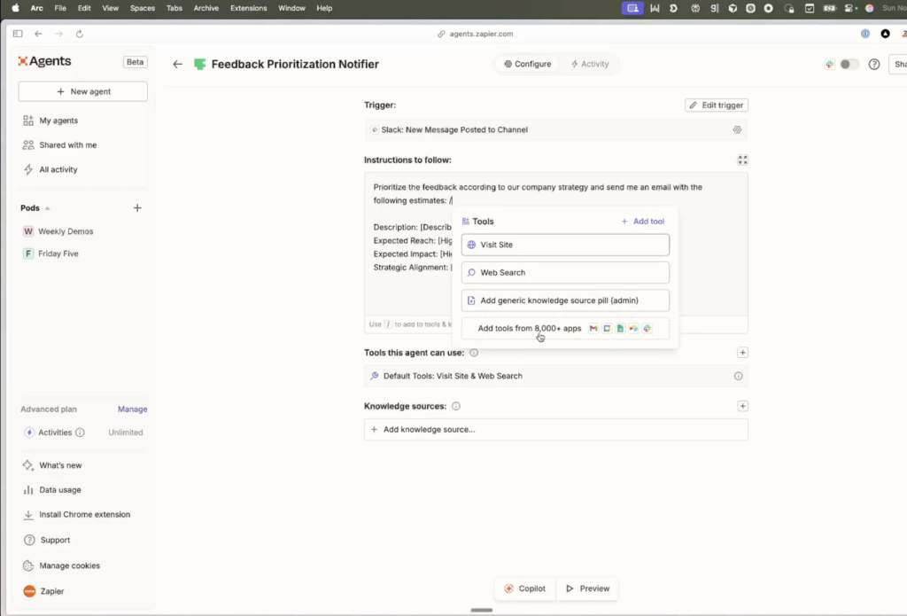 Use tools like Zapier to create an agent that does something for you without asking. Start simple: auto-triage Slack messages, summarize meeting notes, or flag high-priority support tickets.