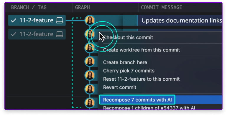 Quickly and easily reorder commits, squash them together, and even rewrite commit messages without having to worry about complicated syntax or order. Simply drag and drop a branch to kick off an interactive rebase, and then you’ll have complete control to pick, reword, squash, and drop commits as needed.