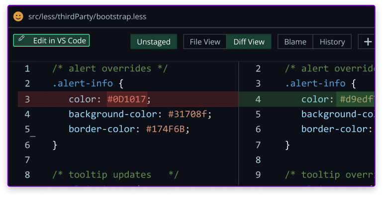 With GitKraken Client’s Flexible Diff View feature, you can edit code directly in the diff view and stay on top of your project’s development with ease.