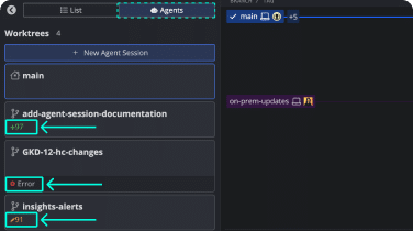 Get one view of every agent across worktrees. See status, changes, and branch context at a glance. Jump into any session to inspect its commit history and keep work moving.