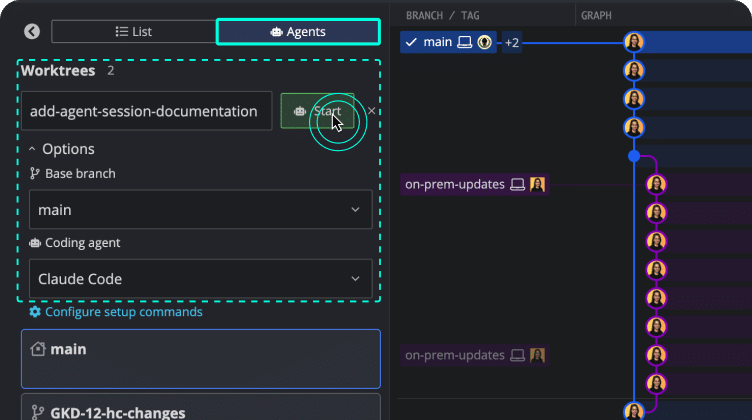 Name the task and start. GitKraken Desktop creates a clean worktree, sets up the environment, installs dependencies, and launches your agent automatically while your current work stays untouched.