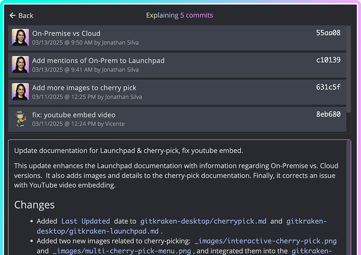 GitKraken Desktop puts advanced Git workflows right at your fingertips–from an interactive commit graph to AI commit message generation. You’ll get a faster, safer way to collaborate across repos and teams, all with pricing that scales to your needs.