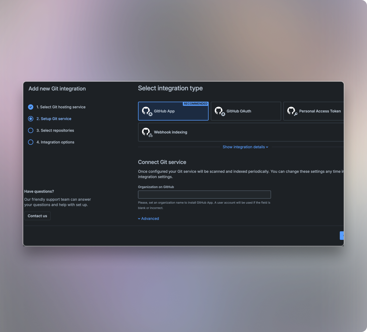 - Integrate with repositories via OAuth, PAT, web hooks, or provider-specific apps